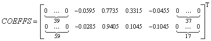 Next, we define a sparse COEFFS matrix that stores the Lagrange interpolation coefficients for fractional delay filters. COEFFS is a N M matrix, where N is the length of the delay line and M is the number of finger holes. Each column of the COEFFS matrix holds Lagrange coefficients for one fractional delay filter. The coefficient groups are padded with zeros, and the placement of coefficients within columns defines the integer part of each delay. For example, let us assume that N = 80, M = 2, the order of the fractional delay filters is 3, and the finger holes are located at positions 40.3 and 60.1. The matrix COEFFS then becomes: